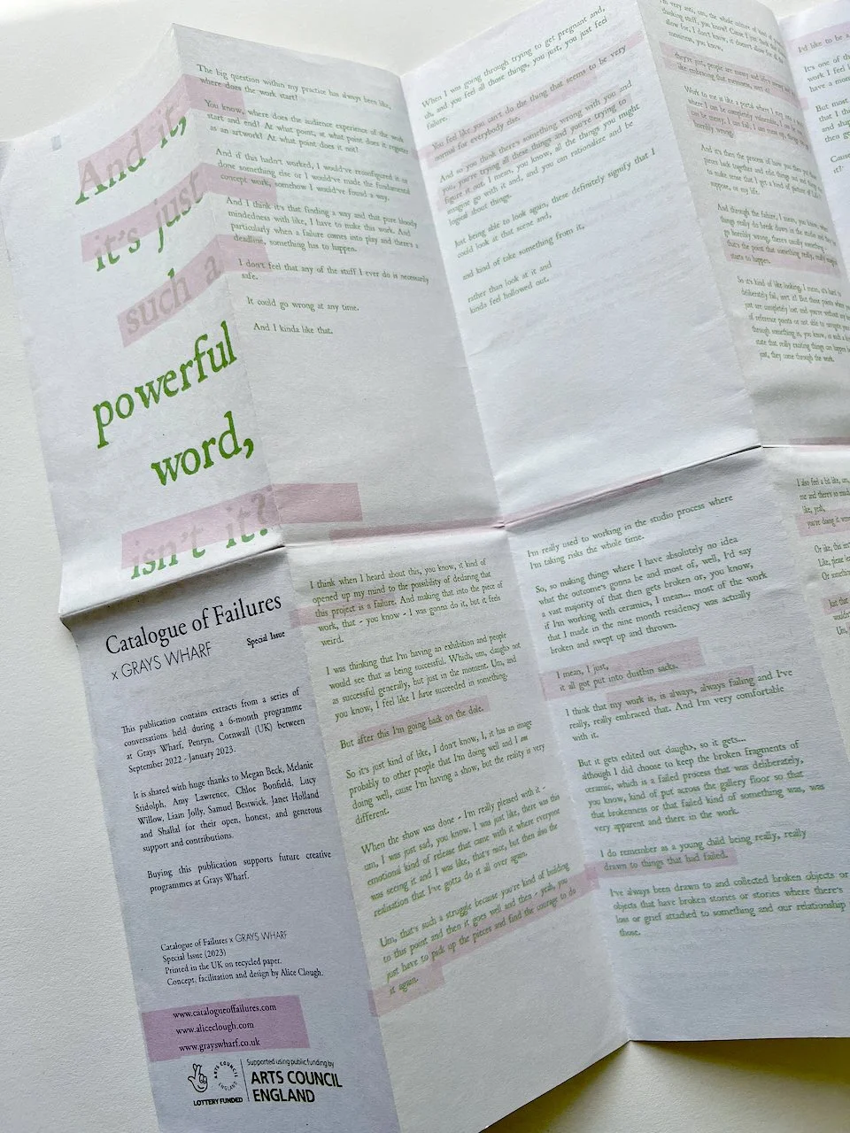 This special edition of Catalogue of Failures contains extracts from a series of conversations held during a 6-month programme at Grays Wharf between September 2022 – January 2023. The programme was made possible with funding from the National Lottery through Arts Council England.