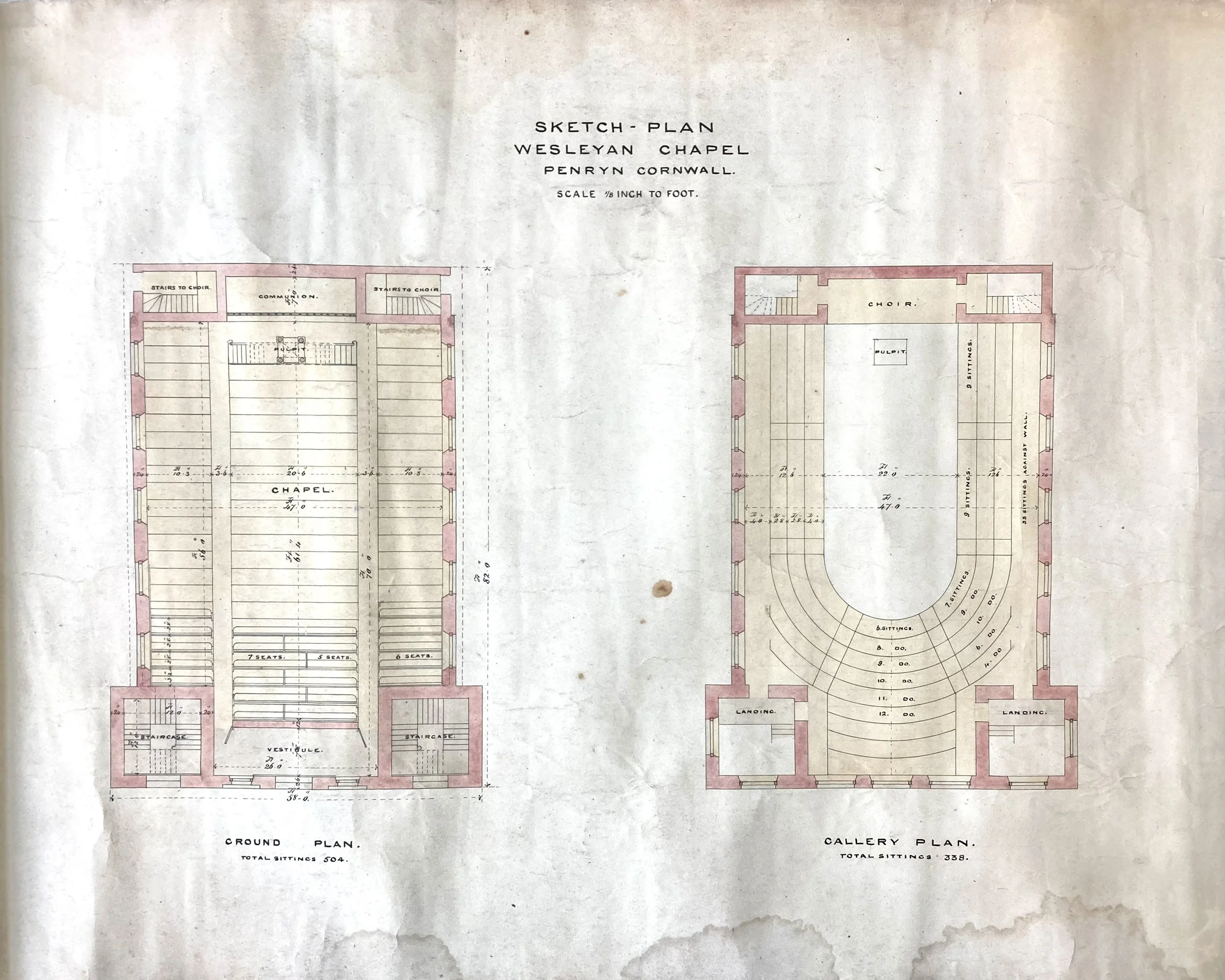 Sketch plan of the Penryn Methodist Church. From the collection at Kresen Kernow, reference MRF/647-650